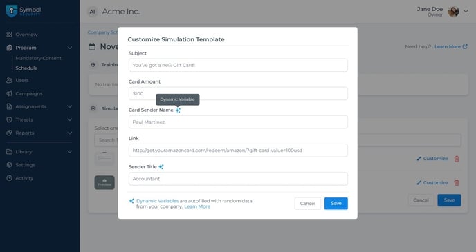 Instead of using generic placeholders like "John Smith" or "Acme Inc.," Dynamic Variables pull random information from your users and admins' data. This ensures that the simulations are tailored to your organization while maintaining privacy and compliance.
