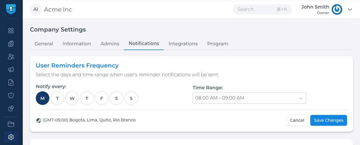This new company setting gives administrators complete control over the frequency (how often) and the timing (when exactly) these reminders are sent out. This means they can choose times that work best for their team and avoid sending reminders when users are unlikely to see them (like late at night or on the weekend).