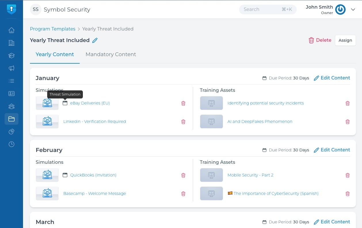 The Program Templates feature allows both MSP and vCISO administrators to assign one or more training assets to all company users before the program's first month begins. Once the Mandatory Content assets are allocated, they are automatically incorporated into the "Mandatory Content" guidelines, ensuring that every new user added to the company receives the same essential content as their peers.